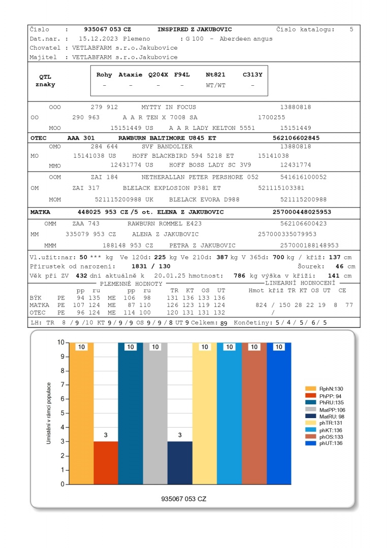 Velmi úspěšné výběry býků v I.turnusu proběhly 19.února v Jakubovicích u manželů Matějíčkových. Zcela mimořádného výsledku dosáhl býk INSPIRED z Jakubovic, který svým přírůstkem od narození 1831 g/den ukázal růstovou schopnost plemene Angus. Díky této užitkovosti dosáhl v roce věku hotnosti 700 kg. I přes mimořádný růst býk vyniká pevnou konstitucí a bezvadnými končetinami. Jeho exterier byl ohodnocen velmi vysoko, a to 89 body. Pro odborníky dodejme, že v jeho rodokmenu dominují plemeníci Johna Elliota z farmy Rawburn - Baltimore a Rommel. Celkově byla předvedená kolekce velmi povedená o čemž vypovídá průměrná známka za lineární popis na úrovni 74 bodů. Blahopřejeme úspěšným chovatelům z Jakubovic.